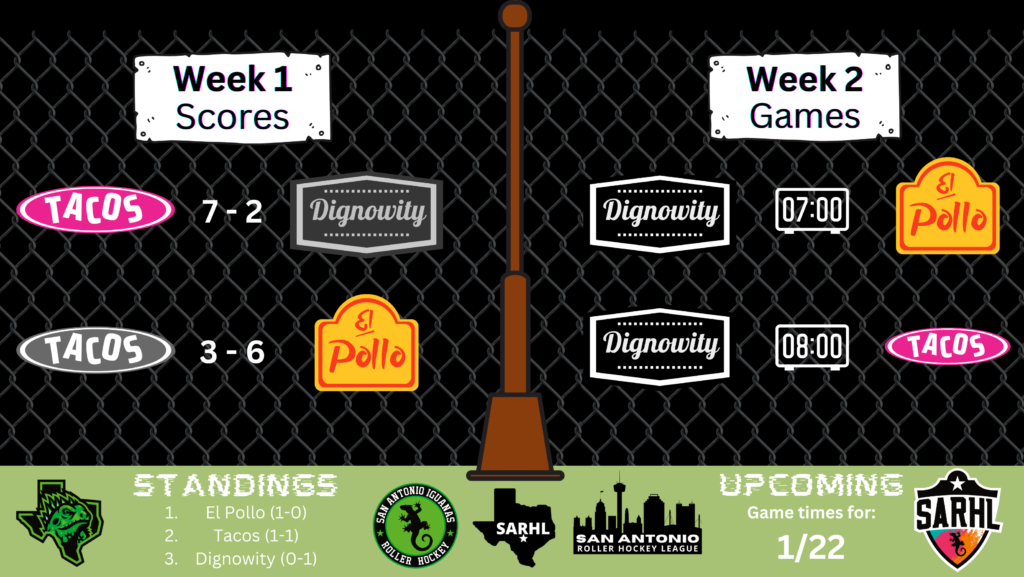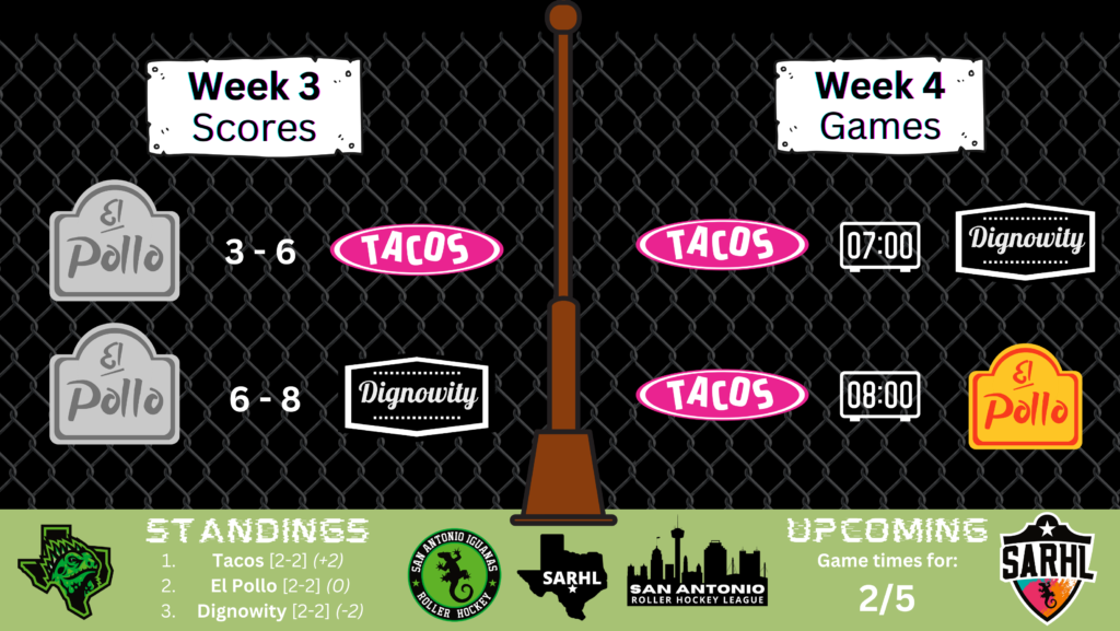 The Winter ’23 season kicked off with a matchup between the Tacos and the defending champs, Dignowity. The weather was near perfect with a slight breeze and after the national anthem, the two teams placed 3 a side on the rink and the season was underway. The Tacos, led by Coach Penn known formerly the Southtown Canadians, are looking for redemption this year after earning the title of last place in the prior season. The game would kick off with a trio of goals by the Tacos to take a 3-0 lead after the first period. Dignowity had troubles getting into their grove with absences from Doho Burdge and Colin Iacarella, who both appear to still be in Disney World post winning the SARHL Fall Championship. Late in the second, Dignowity would find the board for the first team and cut the lead to 4-1. In the 3rd, the Tacos closed out the game by scoring three more while only conceding one to finish the game 7-2.