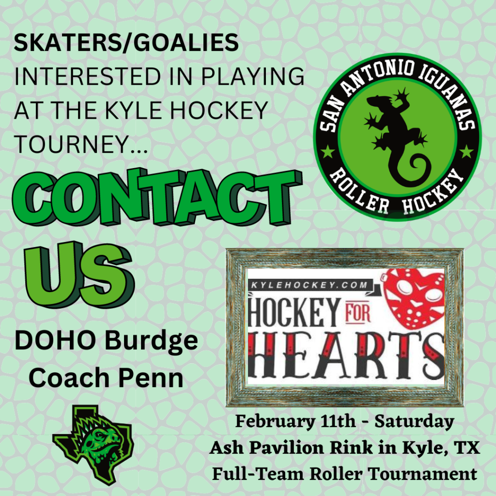 Interested in playing more hockey?!? Well, here is your chance. The San Antonio Iguanas travel hockey program will be competing in the Hockey 4 Hearts tournament this upcoming February 11th, taking place at the Ash Pavilion located in Kyle, Texas. This tournament features full teams (8-10 skaters + goalie) and offers multiple divisions for teams to compete in. If you would like to participate, please contact DOHO Gary Burdge.