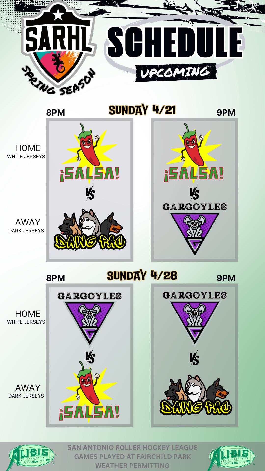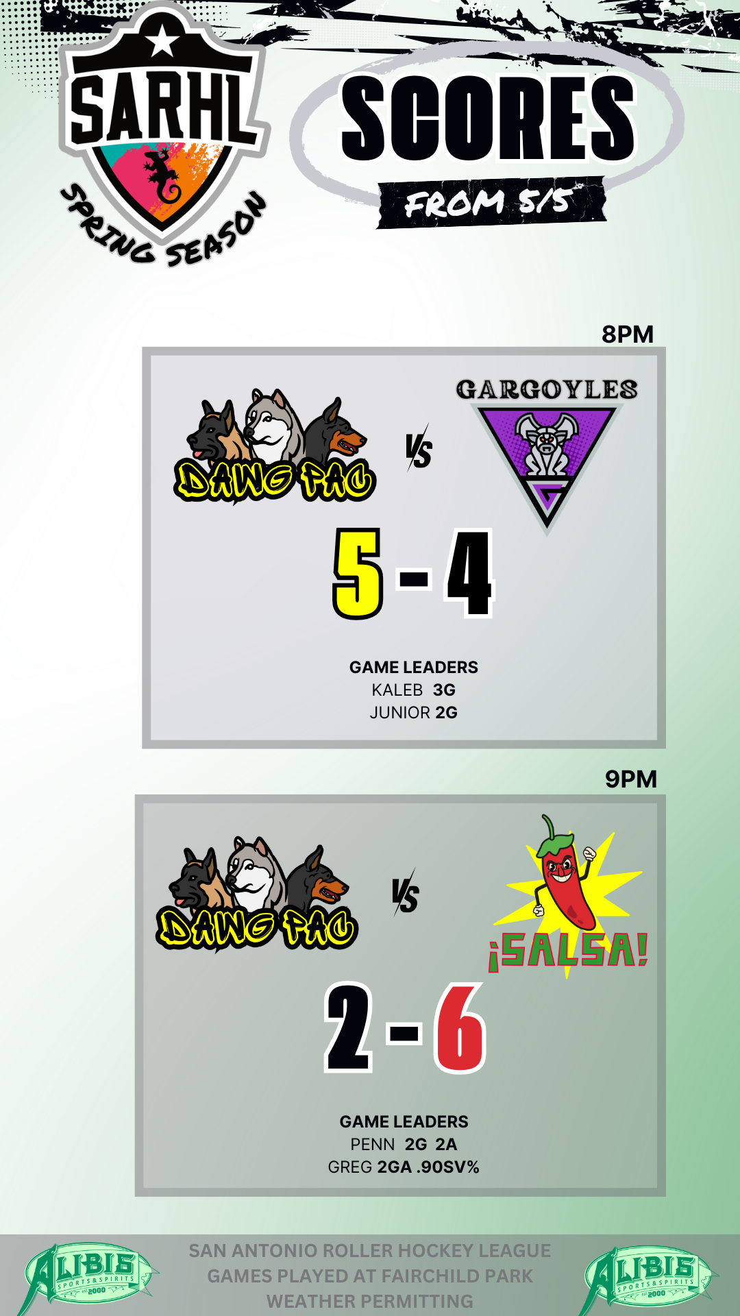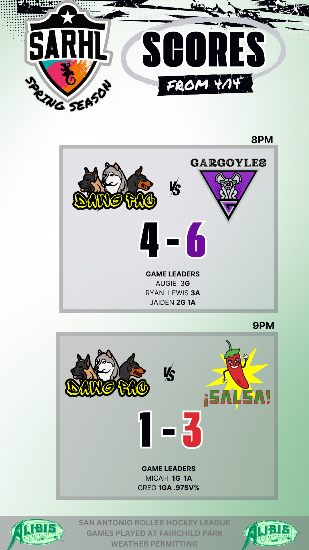 Week 1 of the Spring SARHL Season kicked off with a beautiful rendition of our national anthem by Carrie Underwood underneath a classic pink-and-purple san antonio sunset. The night’s action would feature two close games as the new squads got together for the first time. The Dawg Pac took on the seasons first double-header squaring off against the Gargoyles in the early and the SALSA! in the late. The Gargoyles, led by an offensive charge from Augie aka Mr. Caitlin rallied to a 6-4 win to capture the spring season opener. In the late game, the puck control of the SALSA! by Mallery, Jacob and Micah turned out to be too much for the tired Dawg Pac, resulting in a 3-1 win for the SALSA!. See you next week. Full schedule, stats and standings can be found here: https://sarhl.com/springseason/