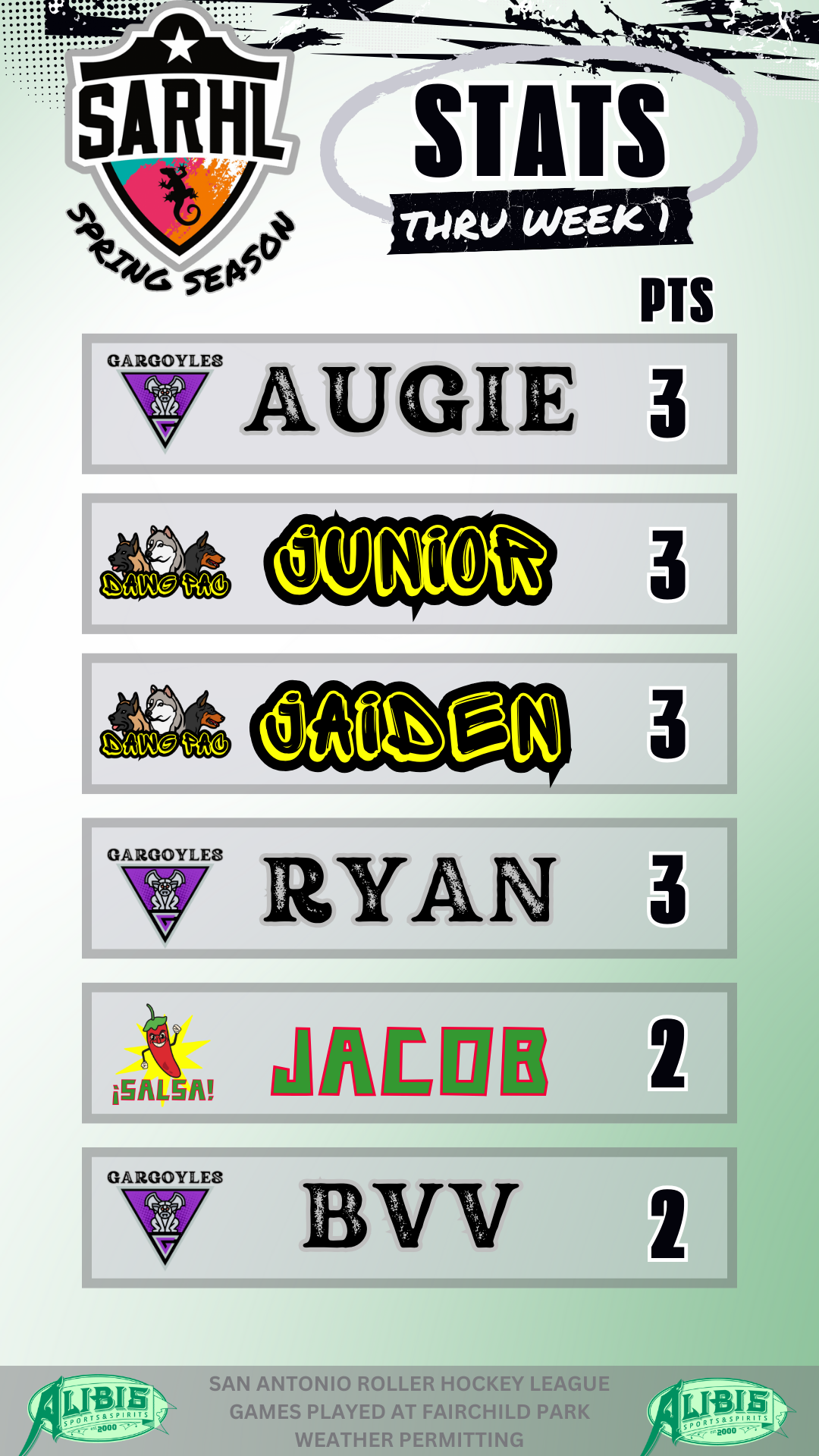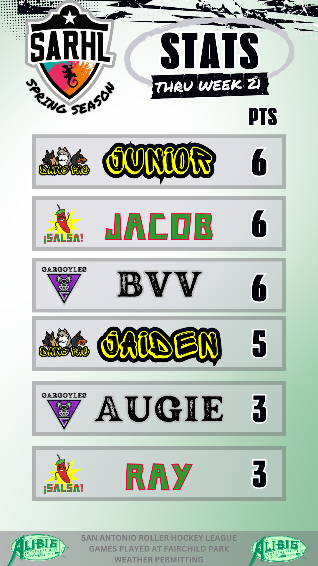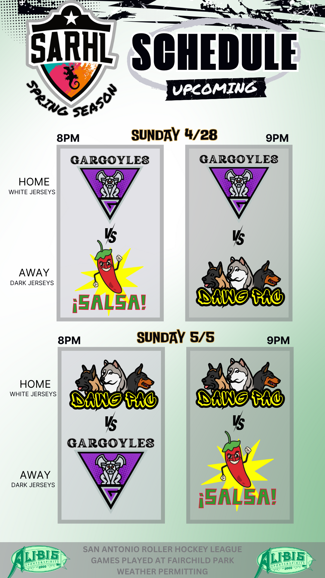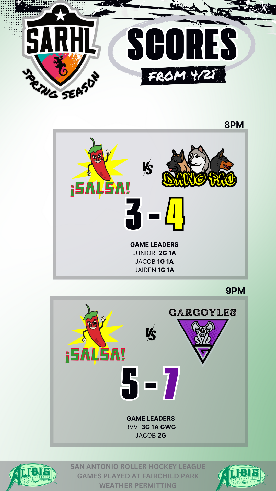 Week 1 of the Spring SARHL Season kicked off with a beautiful rendition of our national anthem by Carrie Underwood underneath a classic pink-and-purple san antonio sunset. The night’s action would feature two close games as the new squads got together for the first time. The Dawg Pac took on the seasons first double-header squaring off against the Gargoyles in the early and the SALSA! in the late. The Gargoyles, led by an offensive charge from Augie aka Mr. Caitlin rallied to a 6-4 win to capture the spring season opener. In the late game, the puck control of the SALSA! by Mallery, Jacob and Micah turned out to be too much for the tired Dawg Pac, resulting in a 3-1 win for the SALSA!. See you next week. Full schedule, stats and standings can be found here: https://sarhl.com/springseason/
