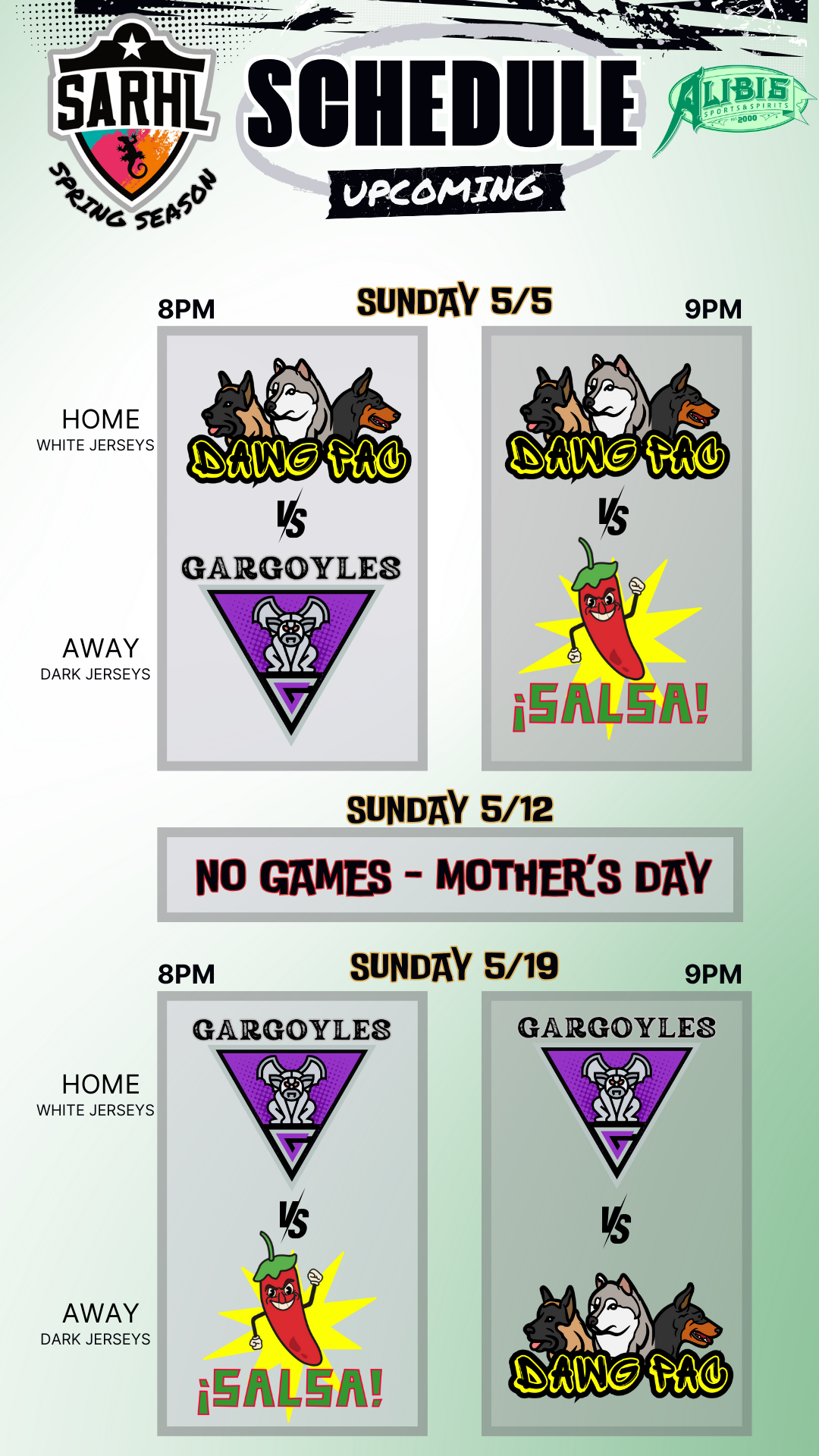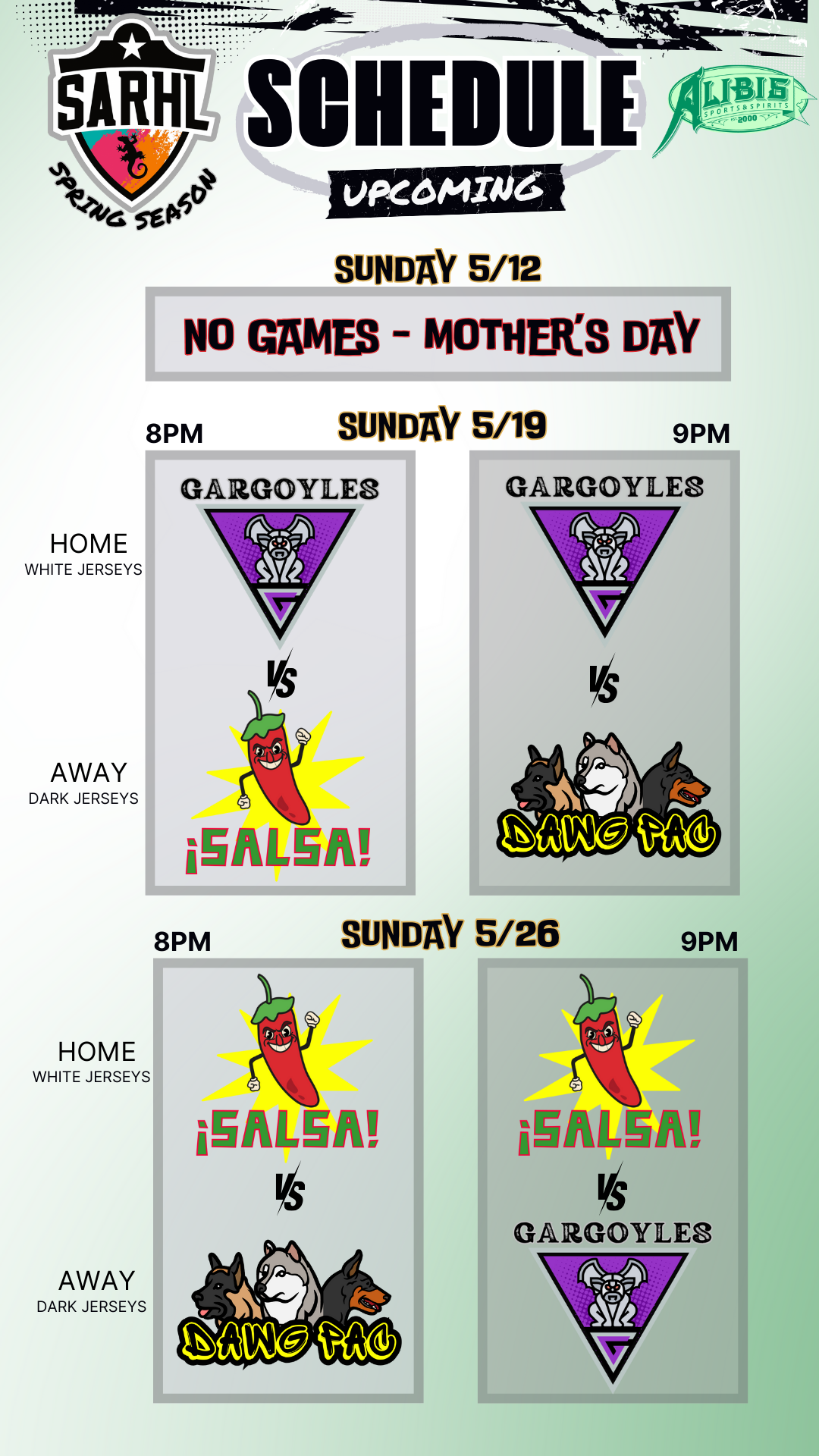 Reminder! No League Games this Sunday 5/12 as the SARHL observes the holiday of Mother’s Day. There will be pickup hockey at 8pm-10pm.