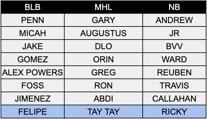 Game 2 starting at 9pm: The home team will remain the Bush Lite Boys to complete the double header. The third team of the league led by captain Andrew Minerd will take the rink as their opponent. The Neato Banditios (NB) will have goaltender Ricky Dominguez for the season.