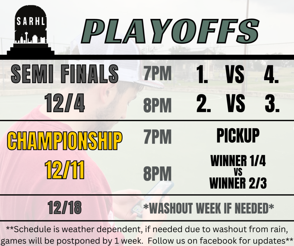 SARHL Fall Season Playoffs – After the Thanksgiving bye weekend will we commence the SARHL Fall 2022 Season playoffs starting the weekend of December 4th with our semifinal matchups. If the weather allows, the schedule goes as follows: