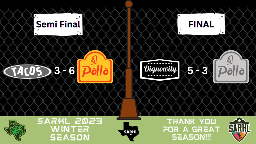 An early Tacos goal would equalize the game going into the final 10 minutes of the semi final match up. El Pollo would score with 5 minutes remaining to take a 4-3 lead over the Tacos. After taking their time out and pulling the keeper, the Tacos would be unable to add any goals and conceded 2 empty netters. El Pollo would secure the semifinal victory 6-3 and move on to play Dignowity for the SARHL Cup.