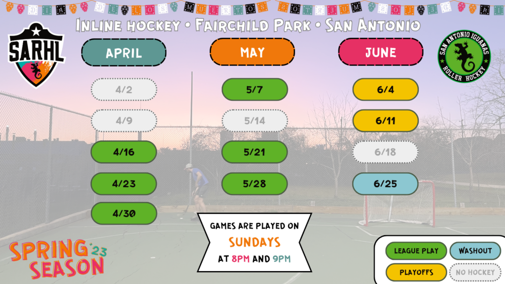 3/29/2023 – We will have pickup hockey Wednesday/Sunday until the return of SARHL on April 16th! Sign up Today. Tentative Schedule listed below. Game play will be 3v3 with goalies (weather permitting).