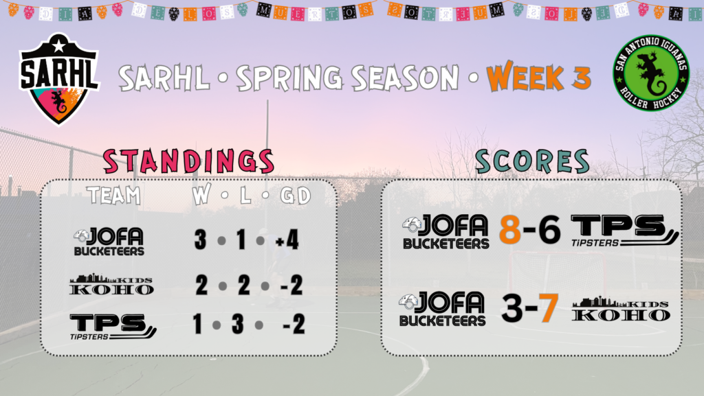 The San Antonio Roller Hockey League was back in action for Week 3 of the Spring Season on a beautiful day after a rainy weekend. The first game of the night featured the TPS Tipsters taking on the JOFA Bucketeers. In a closely contested match, it was the JOFA Bucketeers who came out on top with a hard-fought 8-6 win. Kaleb Morley was the standout player of the game, substituting for JOFA and scoring an impressive 4 goals to help secure the win. Ricky also had a solid performance in goal, earning his first win in net of the season for JOFA. The return of DOHO Gary for the TPS Tipsters added an exciting dimension to the game, despite their loss.