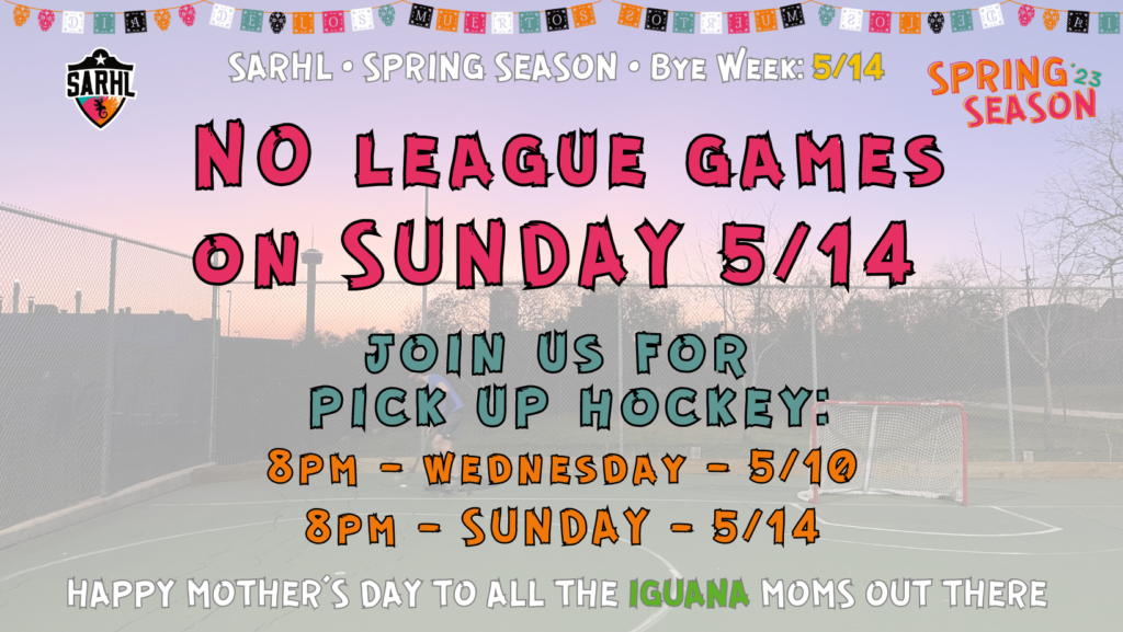 There will be NO League Games on Sunday May 14th as the SARHL observes all holidays. This Sunday is Mother’s Day so get your cards in the mail or stop shopping for presents. Come join us for SARHL Pick-Up Hockey, which will be played on Wednesday and Sunday this week starting at 8pm. Week 4 League Games will return on Sunday May 21st.