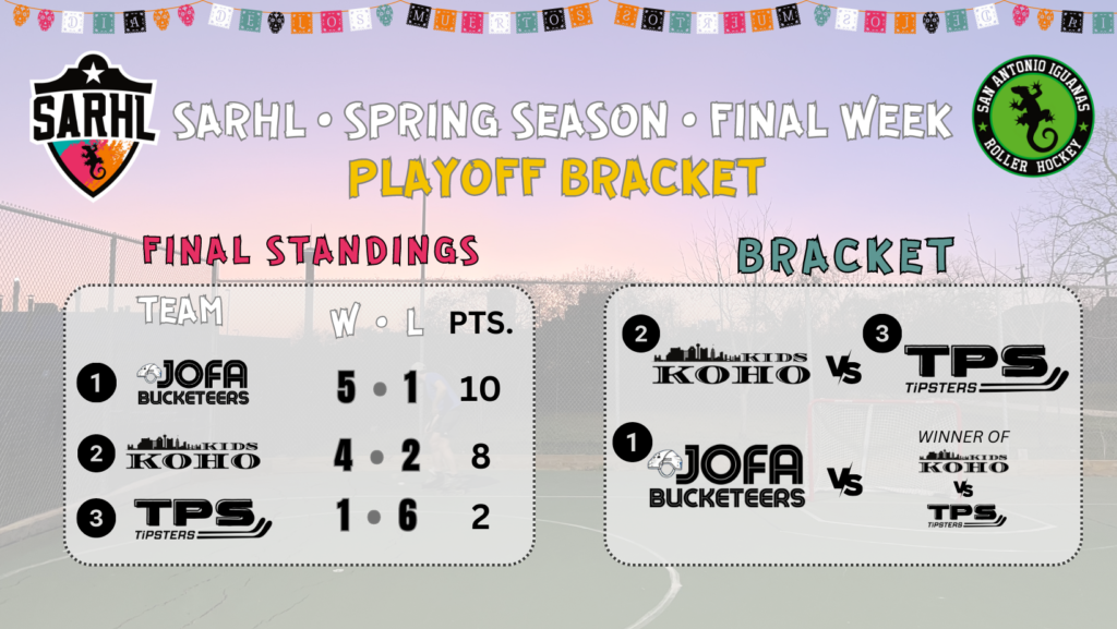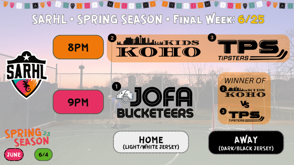 The SARHL Spring Season will have it’s Championship Week this Sunday June 25th starting with the semifinal matchup at 8pm, followed by the championship game. There will be a 15 minute break between semifinals and finals. Stay hydrated during the day and bring water, its supposed to be a hot one!