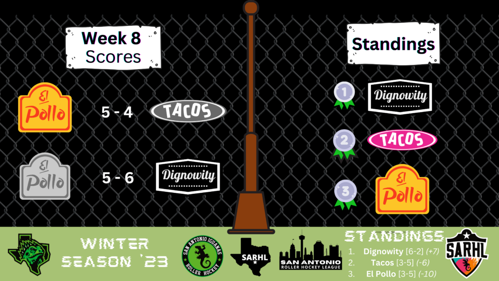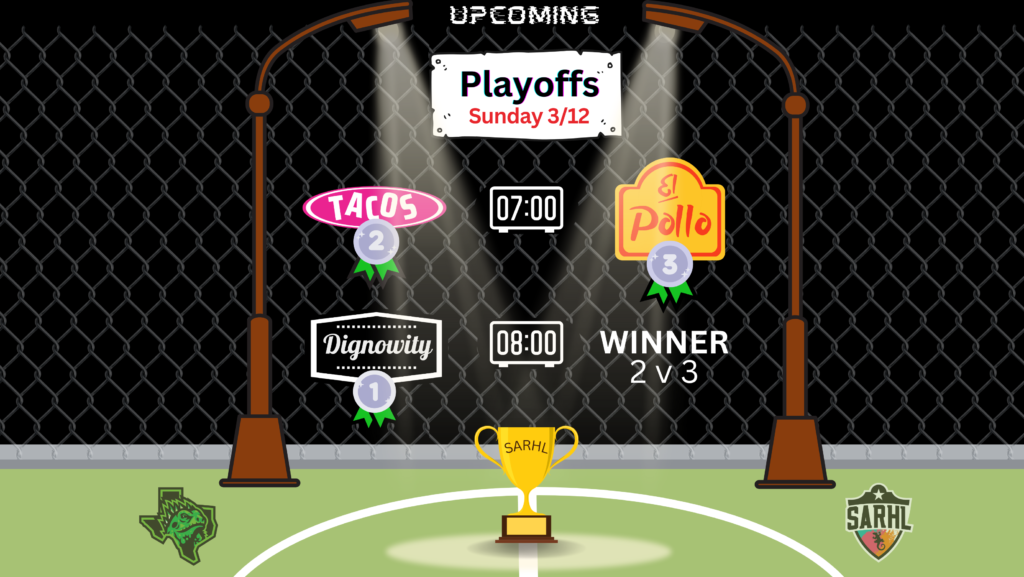 Playoff & Championship Sunday (3/12/2023) – This week will be the SARHL Winter Season final weekend starting at 7pm this Sunday, March 12th. The night starts with the Semi-Final matchup between the Tacos and El Pollo. Both teams finished the regular season with 3 wins and 5 losses, only separated by a difference of 4 goals. The winner of the 7pm game will move on to the night’s Championship game at 8pm where the team of Dignowity awaits. The top seeded squad, Dignowity, finished the season with a 4 game winning streak to secure the bye to the finals. See ya Sunday!
